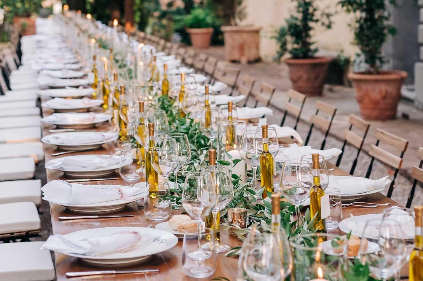 Themed decorations with olive branches and bottles of oil as gifts, a Tuscan wedding in every respect for this romantic American couple.