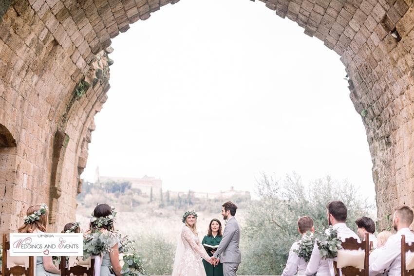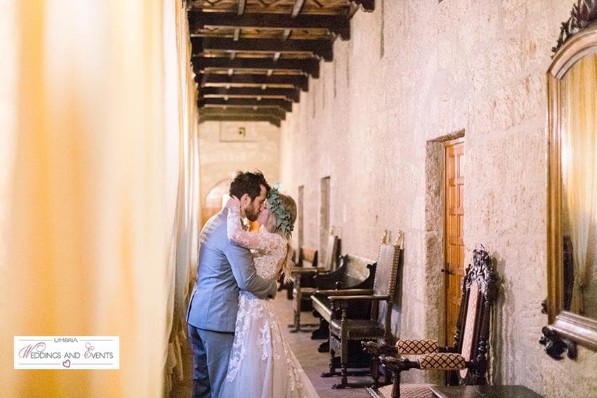 They decided to exchange their vows under the arch overlooking Todi and the ceremony continued with an elegant, luxury family dinner for the reception in the abbey old refectory.